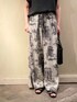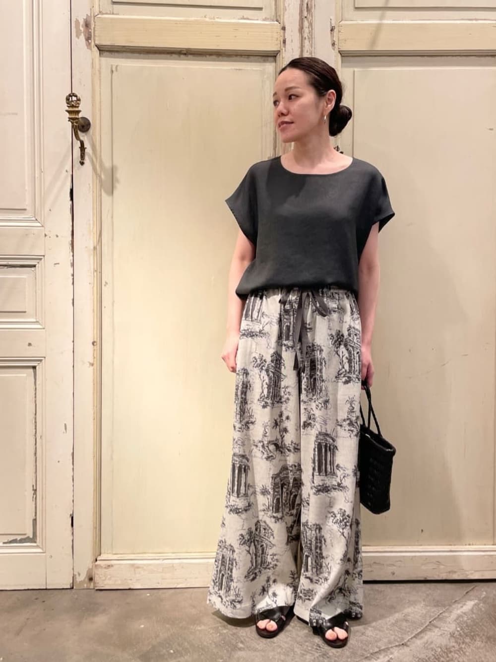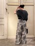 【tops】着用サイズ:F 毎年人気の麻調合繊シリーズに 新しいデザインが登場 ラフに軽く着用できる Tシャツのようなイメージのトップス 肩回りが隠れるフレンチスリーブ キレイ目の素材感で ラフになりすぎない印象に 麻ではなく合成繊維を使用しているので シワも気にならなく お手入れが楽ちんな優秀アイテムです 洗濯 :手洗い可 伸縮性:なし 透け感:なし 裏地 :なし 【bottom】着用サイズ:F オリジナルプリントのイージーパンツ 今季のテーマ“Von boyage”にちなみ 遺跡を巡る旅をしながら ガイドブックにメモをとった そんなイメージで描かれたプリントです ウエストは紐とゴムなので リラックスして着れます 洗濯 :ドライクリーニング推奨 透け感:なし 裏地 :なし
