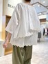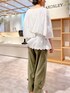 【blouse】着用サイズ:F 裾にインドのカット刺繍を施したコットンブラウス。 背中は生地が重なっているデザインで、ひらひらと動きが出ます。 程良い透け感がある生地感で、さりげなくストライプが入っているので単調なイメージにならず着ていただけます。 お袖も7,8分袖なので羽織いらずで、ロールアップして丈感調節しても良いと思います。 洗濯 :ドライクリーニング 伸縮性:なし 透け感:なし 裏地 :なし 【pants】着用サイズ:F ルーズベイカーパンツに新しい生地のタイプが入荷しています。 柔らかな生地感で広がらず、落ち着いたカーキのカラーが秋冬まで長く使える1本です。 洗濯 :手洗い可 伸縮性:なし 透け感:なし 裏地 :なし 【bag】 Del conte 【shoes】 FABIO RUSCONIのレザーサンダル。 マットなシルバーが悪目立ちせず、さりげなくアクセントになってくれます。 ソールにクッションが入っているので履きやすいです。