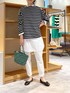 【cardigan】着用サイズ:F カットソー素材のボーダーカーデ。 ゆったりした身幅やアームホールが楽に着られ、ブラウスを重ねても羽織れました。 ボタンの方が少し短めですが、シャツなどレイヤードしてボタン後ろでも着られました。 色々な着方で楽しめる1枚。 スナップボタンで開け閉めできるのも着やすいポイントです。 伸縮性:あり 透け感:なし 裏地 :なし 【blouse】着用サイズ:one size VINCENT JALBERTのシャツチュニック。 アームホールもゆったりで、流行関係なく着られるので長く愛用できる1枚です。 洗濯 :ドライクリーニング 伸縮性:なし 透け感:多少あり 裏地 :なし 【pants】両方とも着用サイズ:2 ドライタッチパンツ:サラっとした肌あたりで涼しく穿けるパンツ。 一度穿くとその穿き心地の良さに驚きます。 明るめなライトグレーのカラーなので透け感が気にならず、秋口にも使いやすい柔らかいお色です。 ウエストはゴムで、紐が通っているので調節ができます。 (手洗い可) 綿タックスリムパンツ:ストレッチ抜群で穿き心地楽ちんなスリムパンツ。 パギンスよりもゆとりがあるので脚のラインが出すぎなくて安心です。 シャツチュニックを合わせたので、裾をロールアップしてすっきりさせました。 (手洗い可) 【bag】 dragon 【shoes】 sample