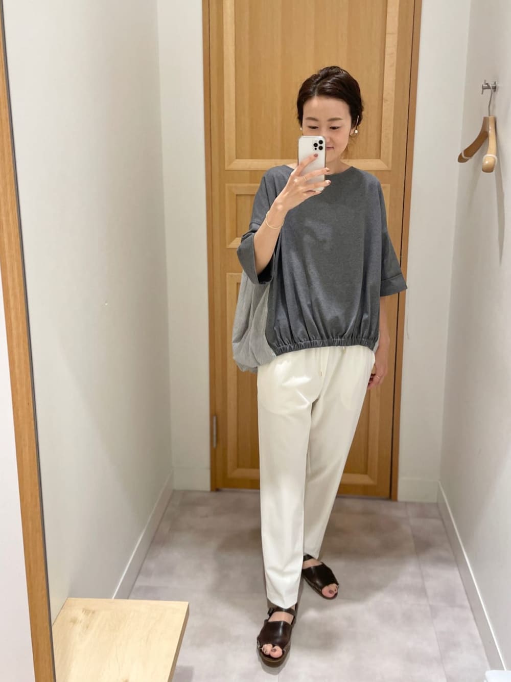 【cutsewn】着用サイズ:F 後ろぷっくりカットソーに、今までにないグレーカラーが登場。 店頭にも入荷しています。 前身頃はカットソー生地で楽ちん、背中には涼やかなストライプの布帛生地が切り替えになっているので、コーディネートに悩む日も1枚でさっと決まります。 後ろはおしり隠れる長さで、お袖も6分丈ほどで安心。 透け感もないので、インナー気にせずに気軽に着られるトップスです。 洗濯 :手洗い可 伸縮性:前身頃はあり 透け感:なし 裏地 :なし 【pants】着用サイズ:F ジャージー素材のトラックパンツ。 伸縮性があり、ハリ感が少ないので長時間座っているのにも楽ちんです。 フリーサイズで、ウエストはドローコードで調節できるようになっています。 洗濯 :手洗い可 伸縮性:あり 透け感:なし 裏地 :ホワイトのみあり 【shoes】 着用サイズ:39 CORSO ROMA 9 ストラップ付きなのでホールド感があります。 レザーが柔らかくなって足に馴染んでいきます。 以前購入したものなので、ダークブラウンを着用しています。 今年の方が、明るいカラーです。