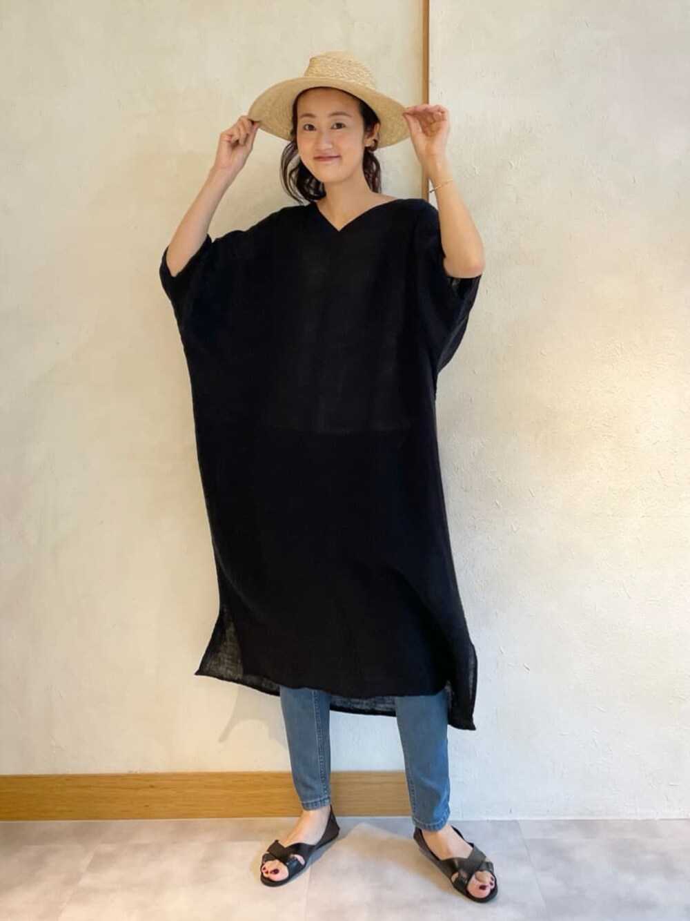 【one-piece】着用サイズ:F カヤ素材のワンピース。 綿100%で1度水通しするとかなり柔らかくなり、ガーゼのような肌触りになります。 夏に凛とした印象になるのブラックのカラーは今までのカヤシリーズでもなかったお色でスタッフ人気も高いです。 重くなりがちなブラックも、透け感のあるカヤ素材なら軽やかに見えますね。 襟元も程よいVネックですっきりです。 洗濯 :手洗い可 伸縮性:なし 透け感:多少あり 裏地 :なし 【pants】着用サイズ:0 伸縮性抜群のデニムパギンス。 ワンピースに合わせたので0サイズですっきりさせました。 洗濯 :手洗い可 伸縮性:あり 透け感:なし 【hat】 sample 【shoes】 着用サイズ:39 CORSO ROMA 9