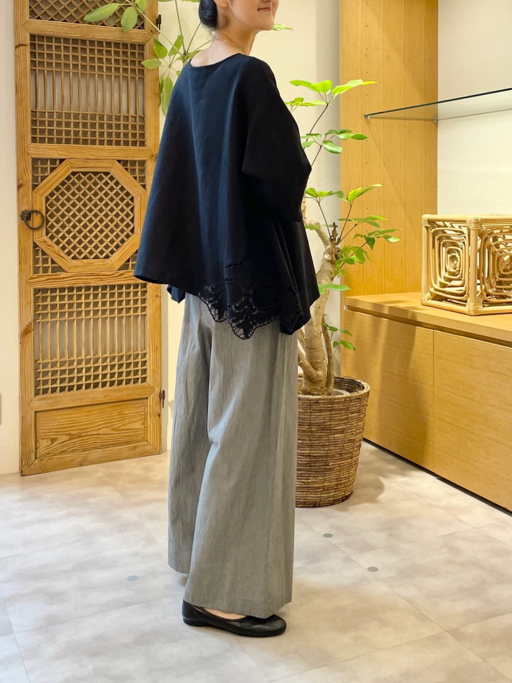 【blouse】着用サイズ:F 裾のカット刺繍がさりげないブラウス。 主張しすぎず、でも目にとまる刺繍がビアズリーならではで、素敵です。 麻レーヨン素材の落ち感のある生地が広がりすぎず、女性らしいシルエット。 肘が隠れる袖丈も、1枚で安心して着られるポイントです。 洗濯 :手洗い可 伸縮性:なし 透け感:なし 裏地 :なし 【pants】着用サイズ:1 ウエストリブ綿ワッシャーパンツ。 肌につかないハリ感のある生地なので暑い夏でも涼しく穿いていただけます。 今回1サイズを着用し、少し腰で落として穿いています。 洗濯 :手洗い可 伸縮性:なし(ウエストはゴム) 透け感:なし 裏地 :なし 【necklace】 近日入荷予定の新作ネックレス。 ゴールドチェーンに大きめパールがポイントで、お食事や結婚式などきれいめシーンでも活躍しそう。 フロントの引き輪の留める位置で輪の大きさや雰囲気を変えて楽しめます。 【shoes】 sample