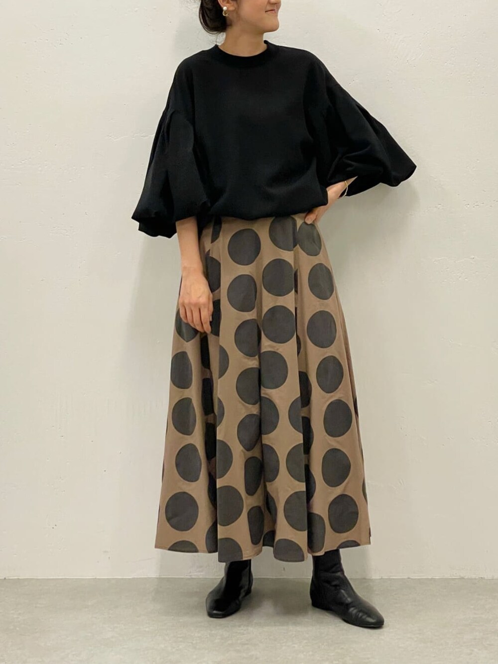 【one-piece】着用サイズ:1 トロミのあるふんわりしたお袖が可愛らしいワンピースをインして着ています。 サイズ展開もある予定なので小柄な方も安心です。 coming soon.. 【skirt】着用サイズ:F ぱっと目を惹くドット柄がオシャレなフレアスカート。 ウエストは後ろのみゴムで、前はトップスをインして着る時もすっきり見えます。 左サイドにジップ付きで脱ぎ穿きできます。 柔らかいブラウンカラーに、チャコールグレーのドットの配色が可愛い1枚。 裏地付きで安心です。 伸縮性:なし(ウエストは後ろのみゴム) 透け感:なし 裏地 :あり 【shoes】 sample