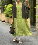 【cardigan】着用サイズ:F 《WEB限定》で追加予約のサラッとカーディガン。 ブラックに近いダークグレーのカラー。 カラー物に合わせてもきつい印象にならなず、色合わせがしやすいです。 きちんと感があるので、オフィスでの冷房対策などにも重宝しますね。 洗濯 :手洗い可 伸縮性:あり 透け感:なし 裏地 :なし 【one-piece】着用サイズ:F 昨日入荷したリネンフレンチテントワンピース。 ぱっと目をひくリーフグリーンのカラーが新鮮で涼しげな雰囲気です。 麻100%で、さらさらと風になびく生地感が着ていても涼しい1枚。 襟元はUネックとVネックで前後どちら前でも着られるデザイン。 私の身長で脛にかかる着丈です。 お色違いはネイビーです。 ¥24,200/BEARDSLEY 洗濯 :手洗い可 伸縮性:なし 透け感:気にならない程度 裏地 :なし 【pants】着用サイズ:1 ストレッチ抜群の綿タックスリムパンツ。 オールシーズン使える生地で、細身なのでワンピースやチュニックに重ねるのにもバランスが取りやすいです。 洗濯 :手洗い可 伸縮性:あり 透け感:多少あり 裏地 :なし 【necklace】 コロンとしたストーントップがナチュラルなネックレス。 華奢なチェーンがストーンをより引き立たせます。 アジャスターで長さ調節ができます。 【bag,shoes】 sample
