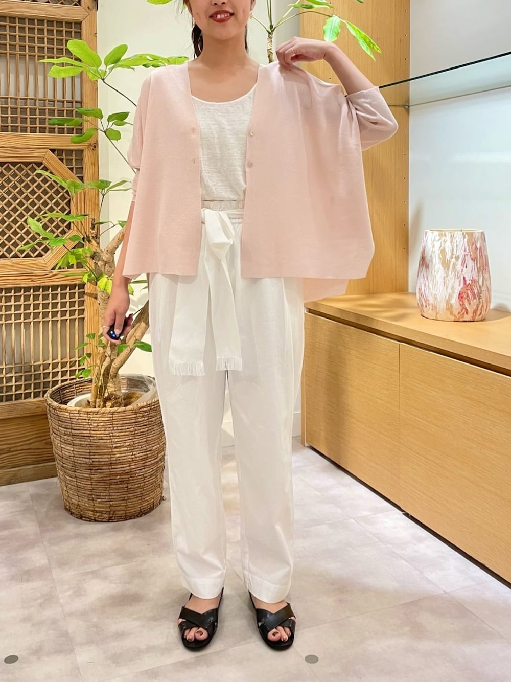 【cardigan】着用サイズ:F 入荷するたびに即完売を繰り返してる サラッとハオリに、新色が入荷しました。 サラッとした肌あたりで、ベタつかないのが嬉しいポイントです。 腰が隠れるくらいの着丈がなので、スッキリとコーディネート問わずお使いいただけます。 シワになりにくいので、夏の冷房よけにバッグに忍ばせておきたいですね。 店頭在庫は残りわずかですので、お早めに。 洗濯 :手洗い 伸縮性:あり 透け感:ほぼなし 裏地 :なし 【pants】着用サイズ:F ウエストのリボンがポイントに。 ヒップ周りにゆとりがしっかりあるので、体のラインを拾わず、安心してお召しいただけます。 158cmの私が履くと、ちょうど良い着丈で履けました。 洗濯 :手洗い可 伸縮性:なし 透け感:少しあり 裏地 :あり 【shoes】 ブラウンのサンダルは、私物 ブラックのサンダルは、CORSO ROMAです。 24.5〜25cmを普段着用する私は、 39サイズがちょうどよかったです。 履いていくと革が馴染んできて、より履きやすい履き心地になります。