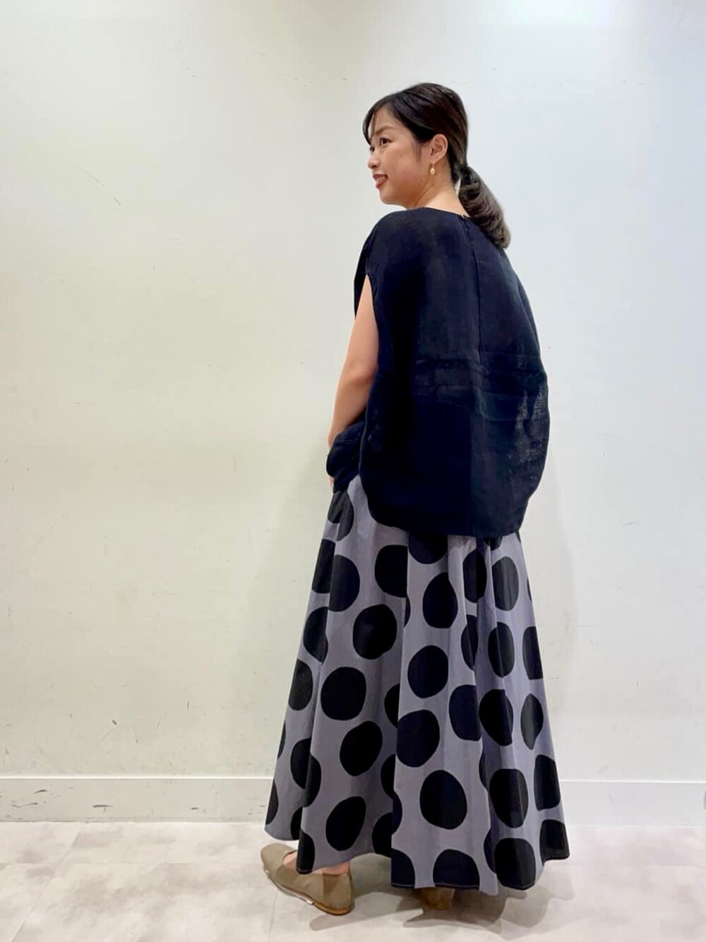 【tops】着用サイズ:F まだまだ暑い、今の季節にぴったりのカヤブラウス。 段々ガーゼのような柔らかい肌触りになり、 着心地も抜群です。 シルエットはビアズリーで人気の丸いシルエット。 後ろの生地が二の腕もカバーしてくれるので安心ですね。 カヤ素材は、透け感があるので タンクトップなどと一緒に着るのがオススメです。 インナー着てもめちゃめちゃ涼しいので、まだの方は、ぜひ1枚ゲットしてみてくださいね。 洗濯 :洗える 伸縮性:なし 透け感:あり 裏地 :なし 【skirt】着用サイズ:F 大きいドットが目を惹くスカート。 柔らかい綿素材なので、ボリュームも出すぎず スッキリとお召しいただけます。 私はお腹で履いて、ちょうどくるぶしくらいの着丈になりました。 軽くて履きやすいので、ぜひ一回お召しいただきたい1枚です。 洗濯 :手洗い可 伸縮性:なし 透け感:なし 裏地 :あり 【shoes】 FABIO RUSCONI 普段24.5〜25cmの私は38サイズを着用。 私は少し大きめな印象を受けたので、インソールを入れたり靴下を履いたりして ちょうどよいサイズ感だなと思いました。 ご検討中の方はぜひ、サイズがあるうちにお試しください。