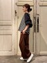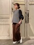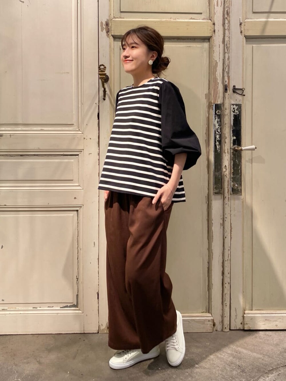 【tops】着用サイズ:F パフスリーブがカジュアルな印象になりすぎずに 着れるボーダーカットソー。 袖口はゴム入りで留める位置によってボリューム感を調節できます。 程よい厚みの綿生地で長いシーズン着れるのが嬉しいポイント。 着丈はお尻にかかるくらいなので、 パンツ、スカート問わず着回せます。 洗濯 :手洗い可 透け感:なし 伸縮性:なし 裏地 :袖部分のみあり 【pants】着用サイズ:1 ビアズリー定番のウエストリブデニムパンツに新色が登場。 秋のムードが漂うカーキとブラウンの2色です。 さらっとした肌触りで分厚すぎない生地なので オールシーズン着回せる万能パンツです。 ワイドですが落ち感があるので綺麗なシルエットで履いていただけます。 私の身長で1サイズはくるぶしが隠れる着丈です。 洗濯 :手洗い可 伸縮性:ウエスト部分あり 透け感:なし 裏地 :なし