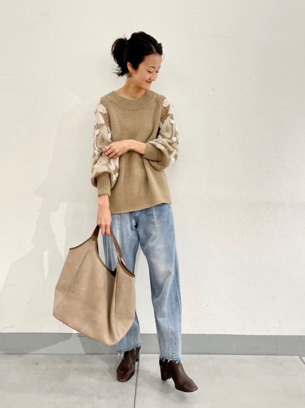 【knit】着用サイズ:F ご予約開始して大人気の花ジャガードニット。 お色違いのベージュがご予約開始。 モカよりのベージュカラーに、お袖のホワイトトーンのジャガードがデニムとの相性も良く、 カジュアルな合わせもかわいいです。 襟元やお袖がリブになっていてきゅっと上げると留まりますが、締め付けのないリブなのでストレスフリーで着ていただけます。 私の身長でおしりにかかる長さ。 パンツでもスカートでも合わせられる着丈です。 洗濯 :ドライクリーニング 伸縮性:あり 透け感:なし 裏地 :なし 【denim】着用サイズ:0 スタッフ人気も高いリメイク風デニム。 とても柔らかくて普通のデニムより薄手の生地なので軽やかな穿き心地です。 裾は切りっぱなしで、タックを入れて丸みのあるシルエットに。 デニム好きにはたまらない1本です。 今回は0サイズを腰穿きしています。 洗濯 :手洗い可 伸縮性:なし 透け感:なし 裏地 :あり 【bag】 BEARDSLEY 【shoes】 sample