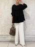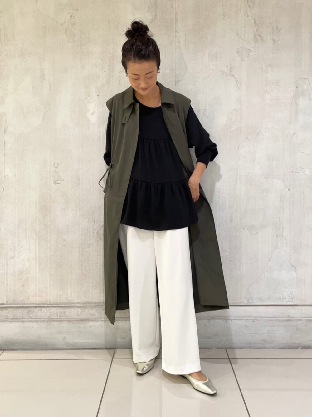 【blouse】着用サイズ:F フェミニンなティアードデザインが目を惹くブラウス。 落ち感のある生地なので広がりも気になりにくいです。 お袖はリブになっていてきゅっと留まるデザイン。 シワにもなりにくいので、デイリー使いはもちろん急なお出かけやご旅行先でのお食事などにも重宝する1枚です。 私の身長でおしりにかかる長さです。 背中のジップで脱ぎ着できます。 洗濯 :手洗い可 伸縮性:なし 透け感:なし 裏地 :なし 【coat】着用サイズ:F マルチウェイトレンチコートのジレを合わせました。 気温差のある今の時期に色々な着方が楽しめるトレンチは店頭にも入荷しています。 洗濯 :ドライクリーニング 伸縮性:なし 透け感:なし 裏地 :なし 【pants】着用サイズ:1 太すぎないシルエットでバランスが取りやすいトラックバギー。 伸縮性のある生地で、洗えてシワにならないので気兼ねなく使えます。 ブラックは雨の日も安心。 1サイズ着用でくるぶしほどの着丈です。 洗濯 :手洗い可 伸縮性:あり 透け感:薄い色のインナーなら気にならない 裏地 :なし 【bag】 《a point etc/アポワン・ウテセ》のアウターやバッグが店頭に入荷しています。 エコファー素材のレオパードバッグは手持ちとチェーンの持ち手がつくので2WAYで使えます。 秋冬のコーディネートのスパイスになります。 オンラインでも近日販売予定です。 【shoes】 2.718のフラットシューズ。 マットなシルバーが華やかさをプラスしてくれます。