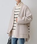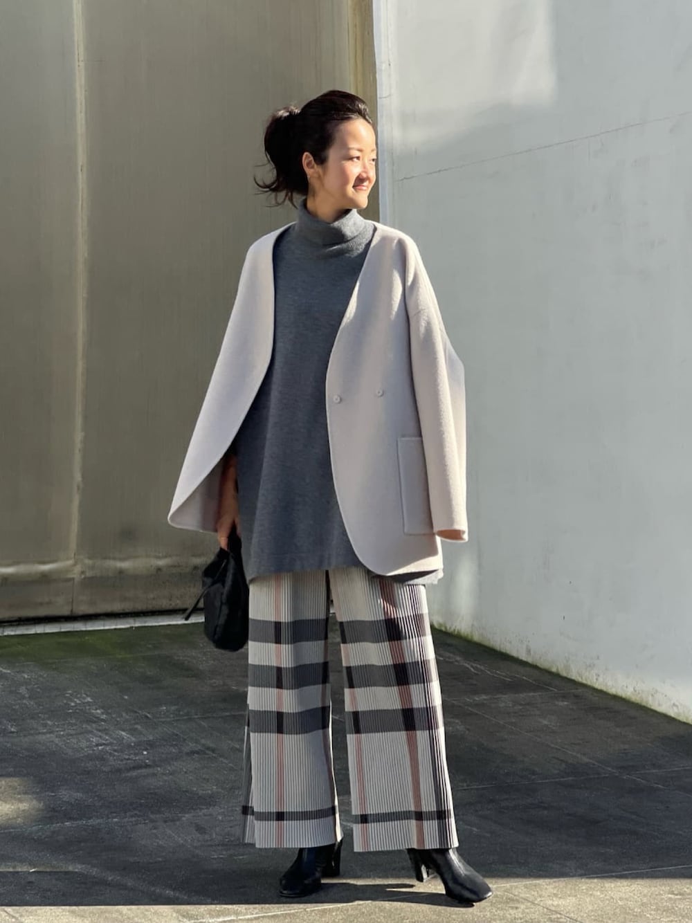 チェックスエードプリーツパンツ。 グレーベースにベージュとダークグレーのラインが入る配色でキリッとした表情に。 プリーツですが広がらず、しっとり落ち感のあるスエード調生地なので 合わせるトップスやシューズ、コートなどできれいめにも合わせられます。 ご予約で大人気のショートリバーコートで上品に。 裏地なしで軽く羽織れ、ゆったりシルエットなのでどんなニットの上にも羽織れやすいデザインです。 両サイドのボタンがポイント。