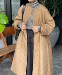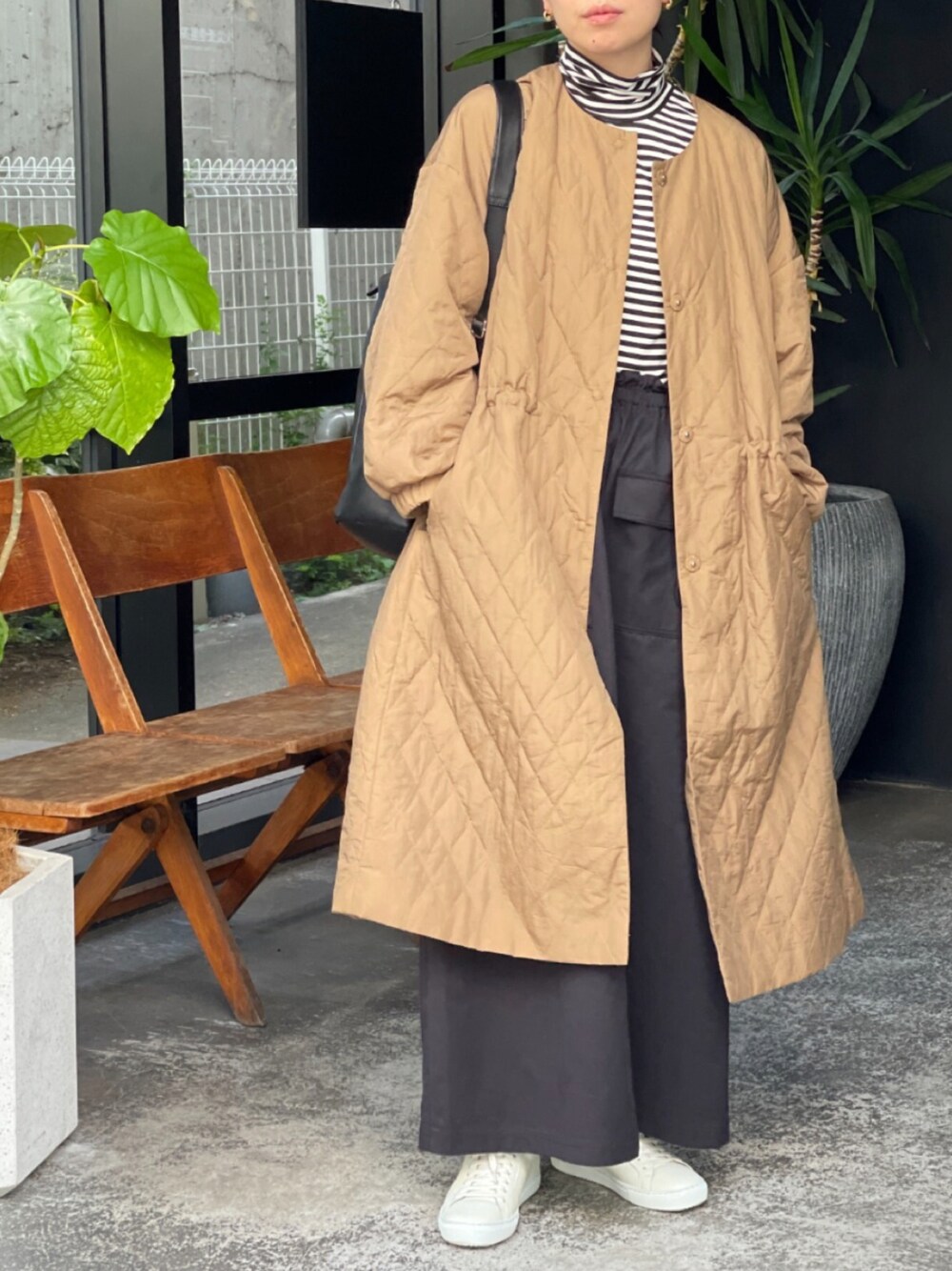 オンラインストア限定で復活しているバルーン袖キルトコート キレイめなスタイルももちろんですが、カジュアルなスタイルにも合います。ロングスカート合わせはタイトスカートにするとバランス良く見えるのでおすすめです。