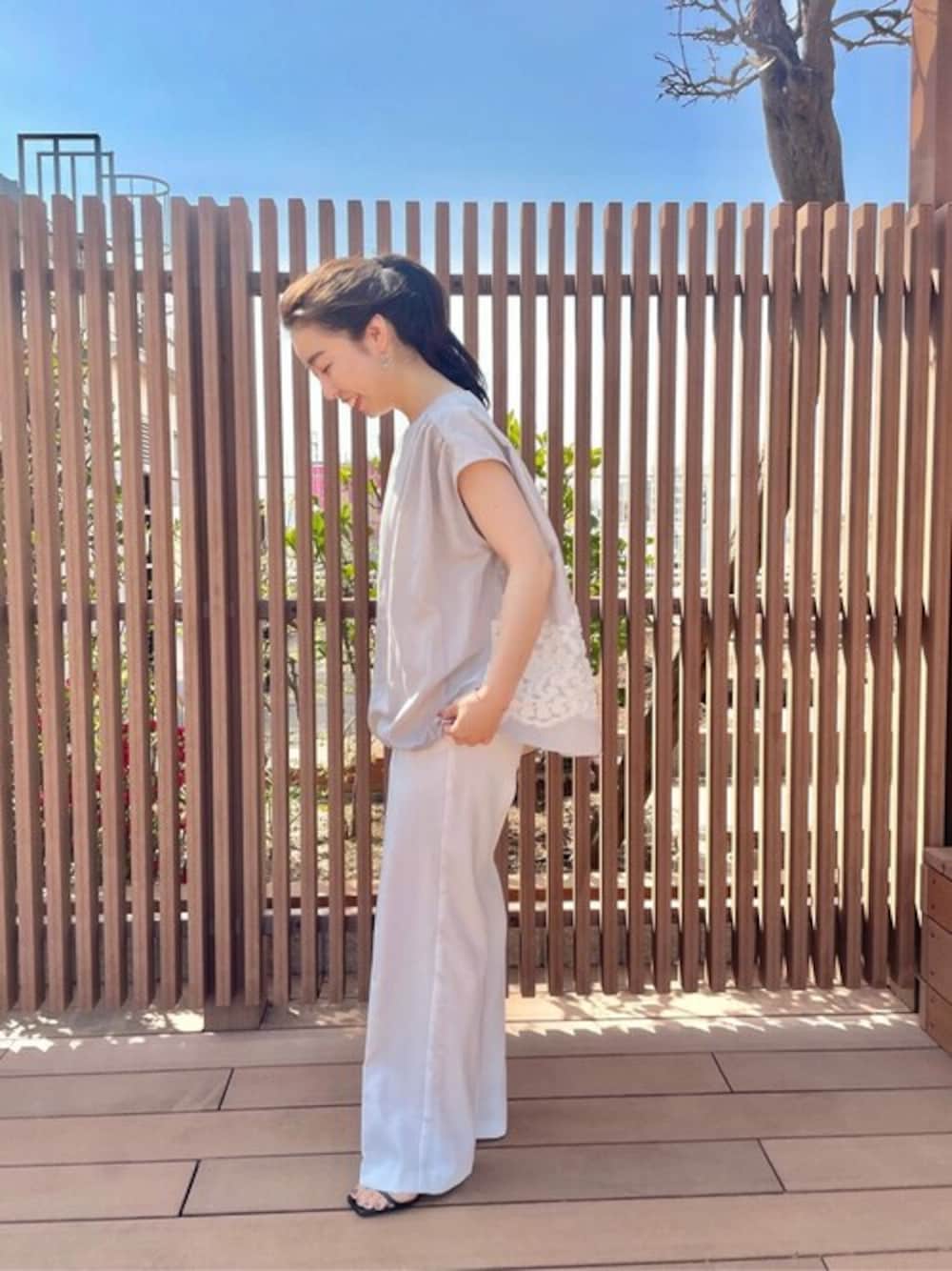 【blouse】着用サイズ:F 以前大人気だったブラウスがWEB限定で登場。 上品なジャガード織りを施した涼し気なブラウスは 薄着になる季節に1枚で着たいですね。 程よく二の腕を覆うフレンチスリーブが嬉しいです。 154cmで腰周りはすっぽり。 ワイドパンツやスカートと合わせてもバランス良く、 細身のパンツと合わせても腰周りは安心です。 洗濯 :手洗い可 伸縮性:なし 透け感:気にならない 裏地 :なし 【pants】着用サイズ:1 シルエットの綺麗なストレートパンツ。 2サイズ展開。154cmで1サイズを着用しています。 ワイド過ぎず、脚が綺麗に見える幅感のパンツは オーバーシルエットのアイテムとも好相性。 洗濯 :手洗い可