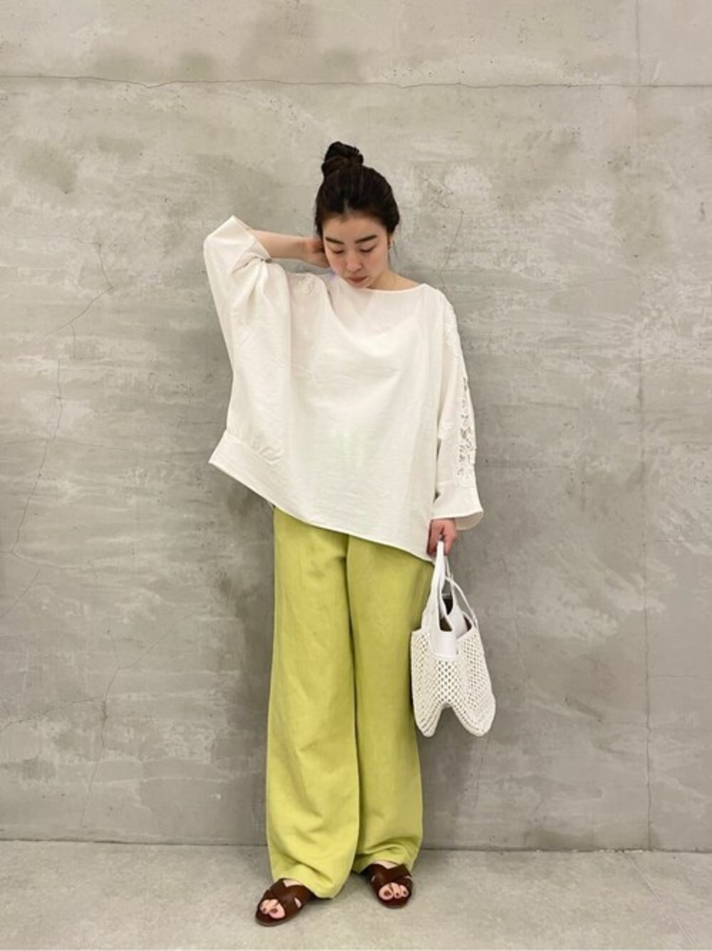 【tops】着用サイズ:F ゆったりとしたブラウスに上品なレースを施し、 1枚で雰囲気のある装いに。 細身のパンツを合わせても腰周りの隠れる安心な丈感です。 伸縮性:なし 透け感:多少あり 【pants】着用サイズ:F 大人のカジュアルスタイルに取り入れたいカラーアイテム。 麻とレーヨンの生地特有のすとんと落ちる素材感も綺麗です。 洗濯 :手洗い可 伸縮性:なし 透け感:気にならない