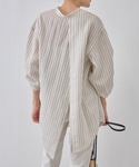 【tops】着用サイズ:F 後ろのデザインがポイントのストライプシャツ。 少しハリのある素材感で肌触りが良く、体のラインを拾わないのですっきり見えします。 羽織として着ても、前のボタンを閉めて着ても楽しめます。