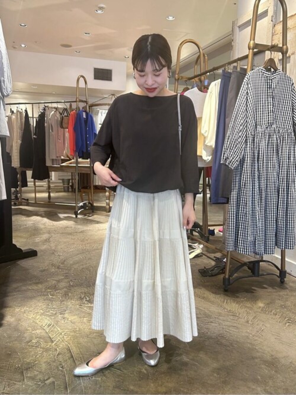 【blouse】着用サイズ: F 綿100%の軽くて涼やかな生地 薄手なので春先から夏まで着ていただけます。 ドルマンスリーブなので脇にゆとりがあり 首周りは開きの少ないデザインです。 洗濯 :手洗い可 伸縮性:なし 透け感:なし 裏地 :なし 【skirt】Fサイズ 細かいプリーツとティアードデザインが細見え効果のあるスカート。 ウエスト周りにはプリーツがないので、 腰回りもスッキリ見えるのも嬉しいポイント。 洗濯 :ドライクリーニング 伸縮性:生地にはなし・ウエストは総ゴム 裏地 :あり