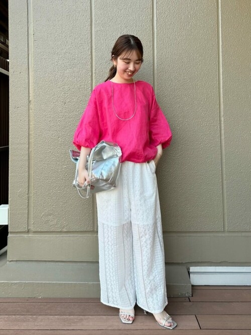 【tops】着用サイズ:F ビアズリー人気のバルーンブラウスが コットンリネン素材の夏仕様で登場。 柔らかな風合いとふんわりとしたシルエットが女性らしい印象に。 ベーシックなホワイトとブラック、夏に気分の上がるピンクとグリーンの豊富な4色展開。 洗濯 :手洗い可 伸縮性:あり 透け感:WHはややあり 【pants】着用サイズ:F 夏に着たい涼しげなレースパンツ。 ウエストは総ゴムでストレスなく着用して頂けます。 159cmの私で足首が完全に隠れる丈感です。 伸縮性:ウエスト部分あり 透け感:あり 裏地 :あり