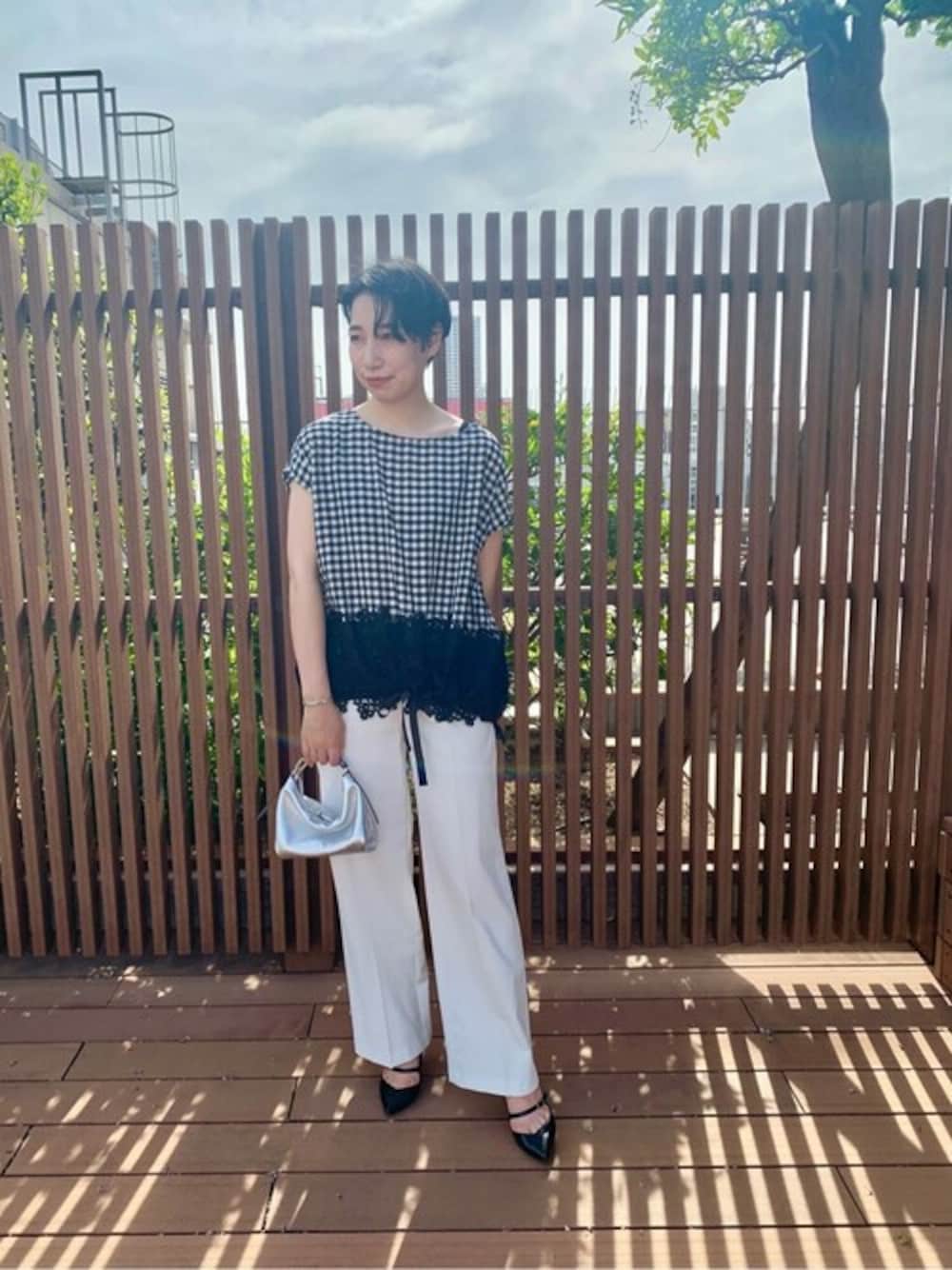 【裾レースブラウス】着用サイズF 大人可愛いギンガムチェックをお仕事スタイルコーデ。 センタープレスの入ったパンツと合わせました。 チェックで可愛さがありながらも裾のレースがエレガントさをプラスしてくれます。 洗濯 :手洗い可 伸縮性:なし 裏地 :なし