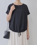 【トップス】着用サイズ:F サラッとした着心地のブラウス。 程よく二の腕を覆う袖や、腰周りまである丈感が安心です。 前身頃の裾はドロストになっているので、ボトムスによって絞り具合を調節可能です。 洗濯 :手洗い可 伸縮性:なし 透け感:なし 【スカート】Fサイズ 小柄さんはゴムを一つ折って着て頂くと すっきりした長さで履いていただけますので、 おすすめです◎
