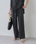 【tops】着用サイズ:F 袖周りの花モチーフが華やかなブラウス。 片面は同布のくるみ釦でデザイン性があり、一枚で着映えします。前後2wayで着られる仕様。 ベーシックなカラー展開なので、様々な色、柄のパンツやスカートと好相性です。 洗濯 :手洗い可 伸縮性:なし 透け感:あり 【bottom】着用サイズ:0 さらさらとした肌触りでシワにならず、楽でとにかく履きやすいドットパンツ。 裾内サイドにはスリットが入っており、ゆったりしすぎないサイズ感が美脚効果も。お出かけ着の雰囲気を損なうことなく程よいラフさをプラスしてくれます。 洗濯 :手洗い可 伸縮性:なし 透け感:なし 裏地 :なし 【bag】BEARDSLEY 【shoes】CORSO ROMA