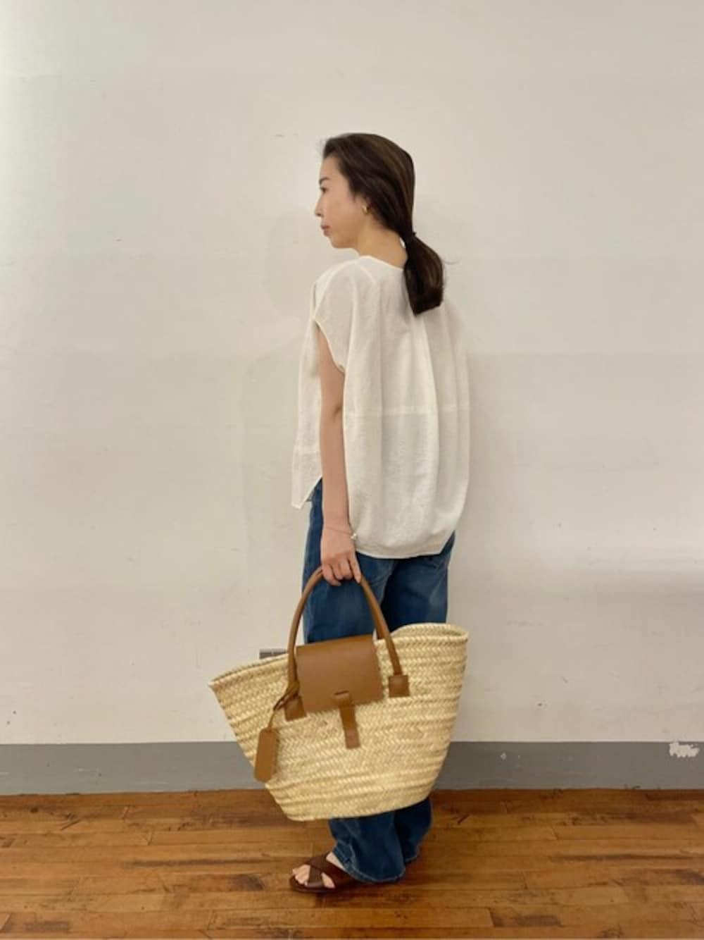 【tops】着用サイズ:F 丸みのあるシルエットがポイントのブラウス。 ジャガード織りが施された生地が高級感のある1枚です。 程よく二の腕を覆う形なので、暑い時期も安心。 センタープレスの入った綺麗めなパンツでも、 デニムでカジュアルに合わせたり、幅広く着られます。 洗濯 :手洗い可 伸縮性:多少あり 透け感:なし 裏地 :なし 光沢感:なし 【pants】着用サイズ:F オリジナルのストレートデニム。 とても柔らかく履き心地抜群。 足が綺麗に見えるのも嬉しいです。 薄く柔らかいので、夏場の時期にもおすすめ。 【shoes】 人気のコルソローマのサンダル。 シンプルなので様々なお洋服と相性の良いアイテム。 クロスデザインがさりげなくコーディネートのポイントに。 歩きやすく足に馴染みやすいレザーサンダルです。