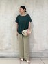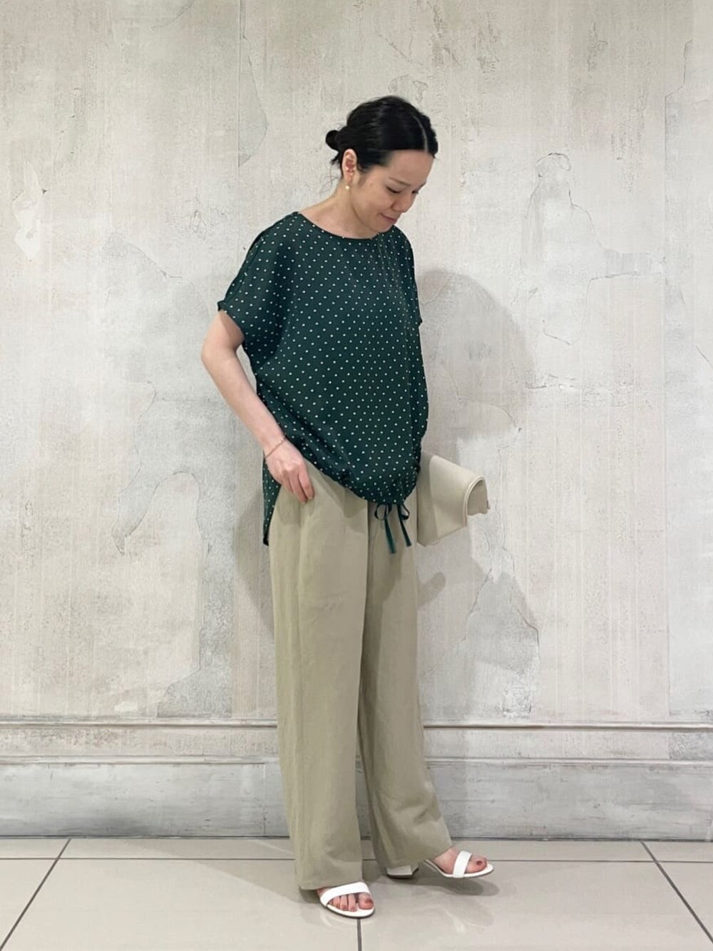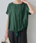 【tops】着用サイズ:F 小さめなドットプリントのブラウス サラッとした生地感が 暑い夏時期にも快適な一枚 前身頃の裾にリボンを通しているので 絞るとフロントの着丈の調節可能 落ち感がありスッキリ着れるので コーディネートを組みやすいアイテムです 洗濯 :手洗い可 伸縮性:なし 透け感:なし 裏地 :なし 【bottom】着用サイズ: F ナチュラルなシワ感のあるワイドパンツ リネンらしい涼やかな質感と 透け感のないサラッとしたシャリ味のある1本 ウエスト部分はドローコード付きなので ウエストの調節も可能です 洗濯 :手洗い可 伸縮性:なし 透け感:なし 裏地 :なし