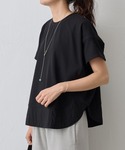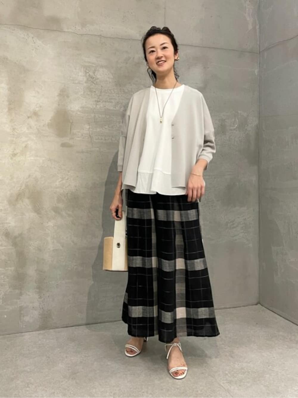 【blouse】Fサイズ Tシャツ感覚で着られる、裾がラウンドカットになったプルオーバー。 生地に伸縮性があり、シワにならないので扱いも楽ちん。 裾と生地を切り替えていて、1枚でレイヤード風のデザインもサマになります。 白ですが透け感が気にならないのも嬉しいポイント。 【pants】Fサイズ スカート見えするチェックワイドパンツ。 リネン混で夏場にもピッタリなリラックス感のある生地。 裏地付きなので透け感気にせずに合わせられます。