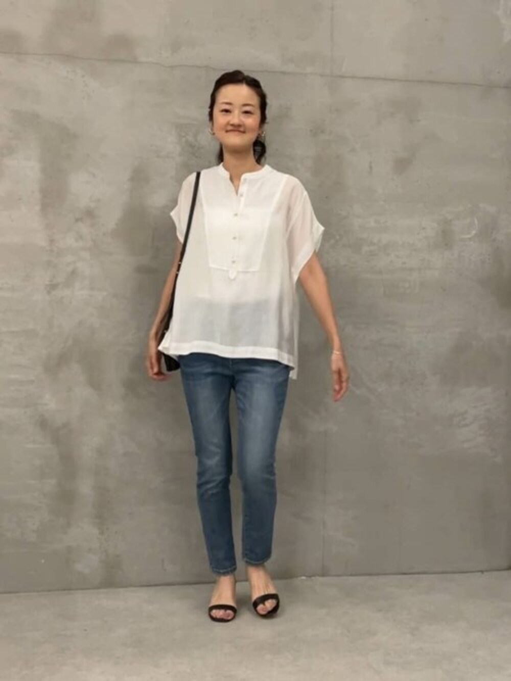 【blouse】Fサイズ パール釦がポイントのフレアブラウス。 背中にタックが入って生地が足されているのでフレアシルエットになっています。 つるんと落ち感がある生地なので広がらないシルエットです。 お仕事や、学校行事などのシーンにも重宝します。