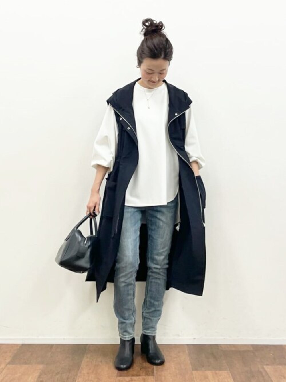 【jilet】Fサイズ 撥水加工が施されたロングジレ。 ジレと言ってもデイリーに使いやすいジップ付きのデザインで雨の日にも気兼ねなく使えます。 裏地なしで軽く、生地にはかなり伸縮性があります。 ウエストのドローコードでギャザーを寄せてシルエット変えて楽しめます。 166cmで膝にかかる着丈です。 【boots】 ラムレザーで柔らかいショートブーツ。 オーバルトゥで足元を女性らしく見せてくれます。 ヒールも太めで安定感があり長時間履いても疲れにくそうです。 普段24.5cm/38サイズを履く私で24.5cmかわちょうど良いです。