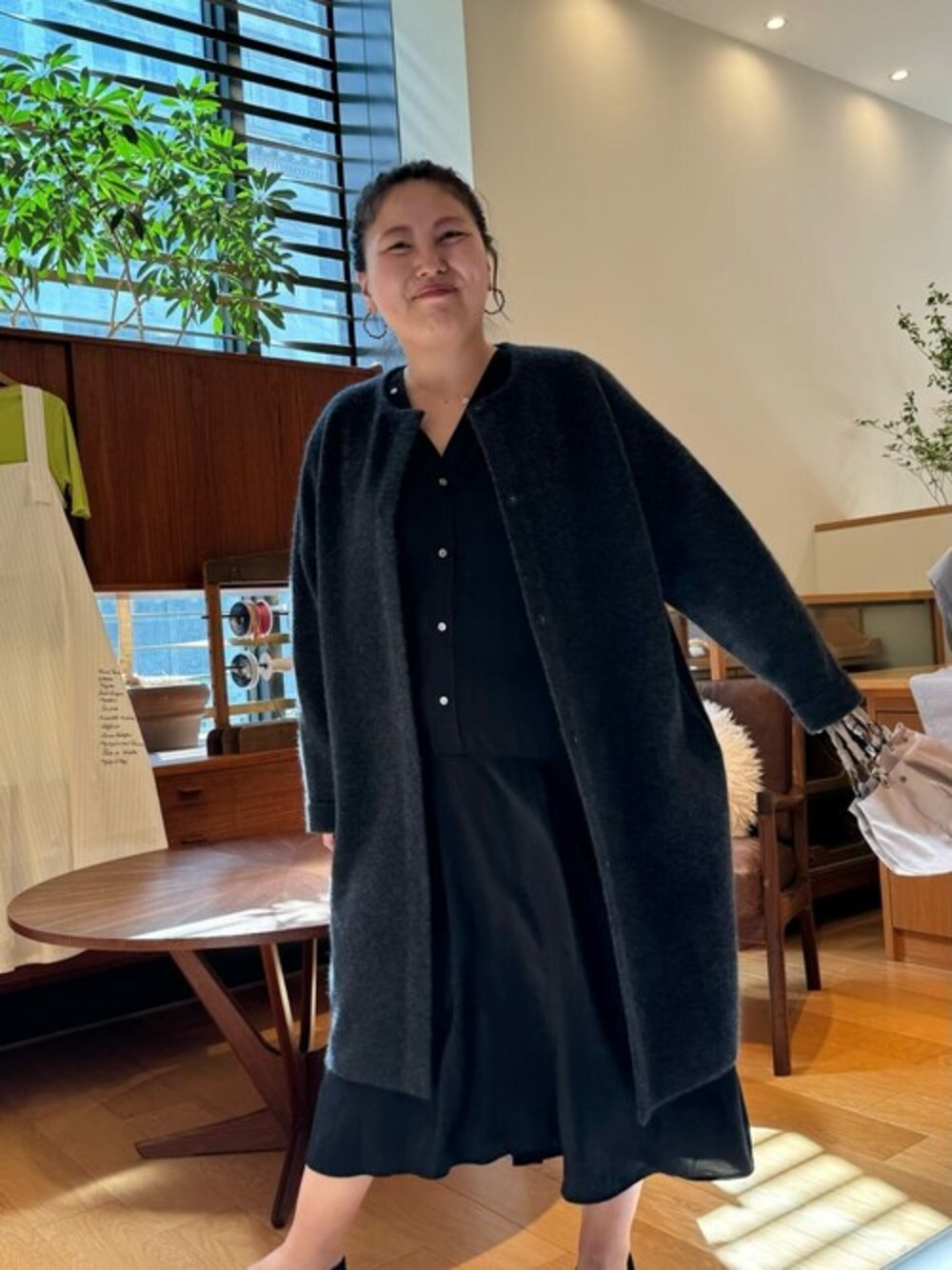 BEARDSLEY(BEARDSLEY)のノーカラーコート「ニットコートロング」を使ったコーディネート