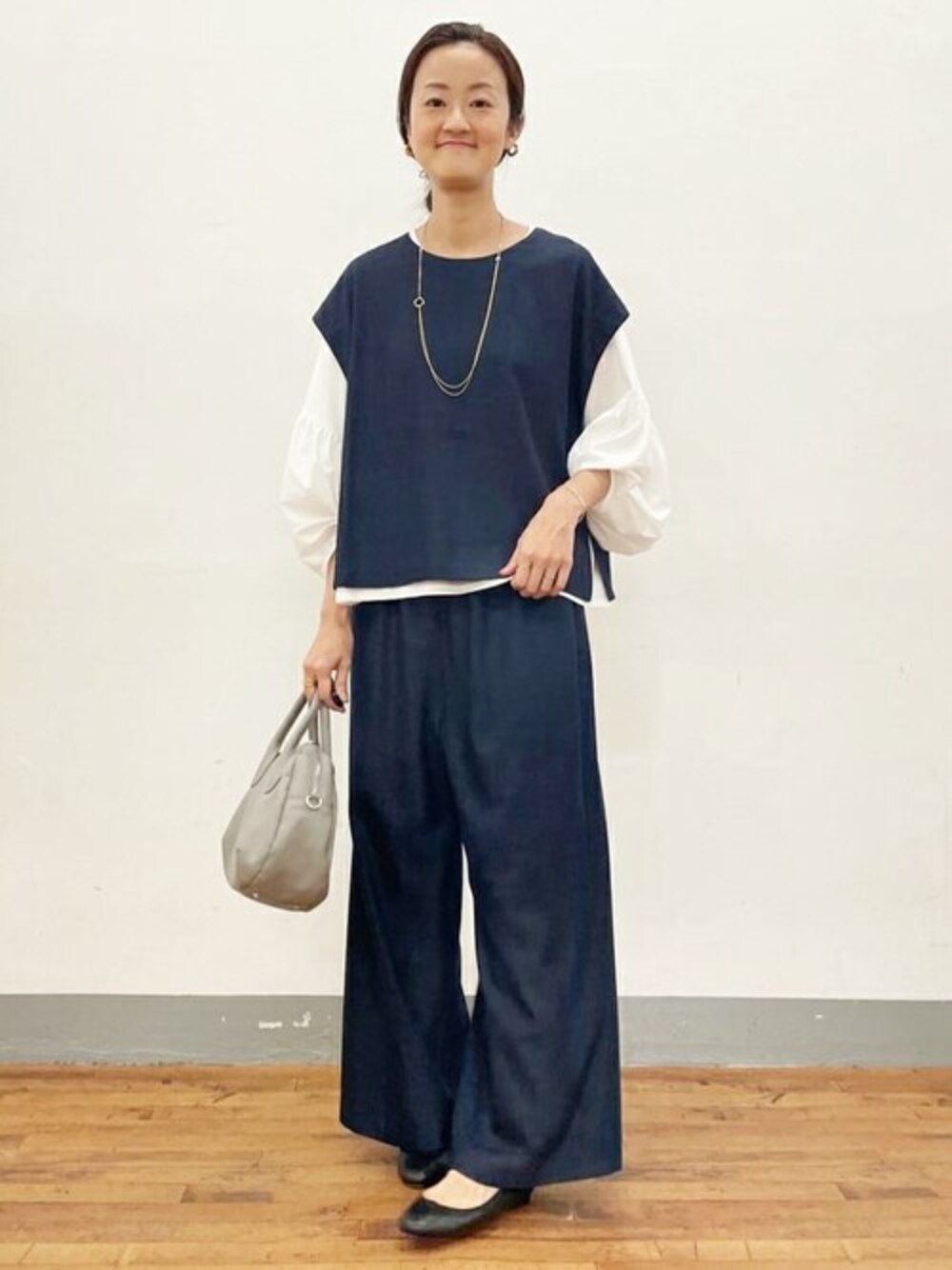 マルチウエストリブパンツとショートベストのセットアップコーデに、インナーは袖ギャザーシアーTeeをコーディネートしました。 ベストのお袖からのぞく袖ギャザーが女性らしく、落ち感のあるカットソー生地なのでボリュームが出すぎず色々なインナーに使えそうです。
