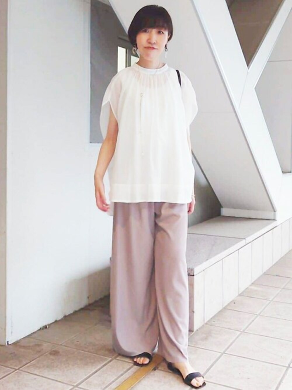 【blouse】 シフォンのような軽やかな生地で、見た目も着心地も涼やかなアイテム。 暑いけどオシャレしたいときに着るだけで映えるデザインです。 ヒップも隠れますし、フワッとお腹周りもカバーできます。 【pants】 サラサラした質感で、暑い日も快適な履き心地です。 ウエストのゴムもかなり伸びます! 微光沢なのでカジュアルすぎずに使えますし、シワにならないところも◎ 164cmで1サイズはしっかりフルレングスになりましたので、高身長さんにもおすすめです。 ウエスト一折すると、踵が見える丈になりました。