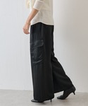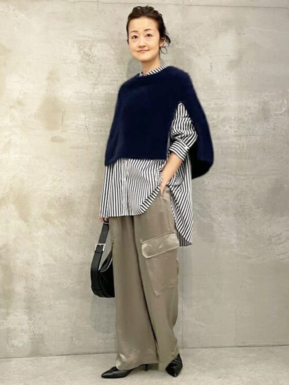 カシュクールデザインでも使えるストライプシャツに、昨年も大人気だったファーニットポンチョの新色ネイビーを重ねました。 光沢感のあるカーゴパンツを合わせて、素材感の違いを楽しむコーデ。