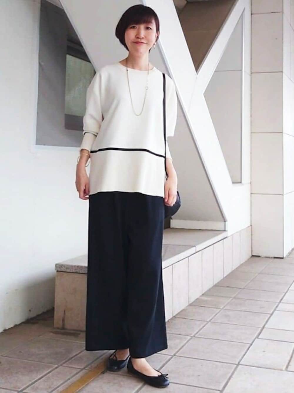 【knit】 シンプルながらも、ラインが程よいアクセントになり着回ししやすいアイテムです。 サラッとした質感の薄手のニットは秋口〜冬の暑い室内にも、長い期間活用できそうです! ホームクリーニングできるのも嬉しいポイントです。 【pants】1サイズ着用 微光沢の生地感なので、キレイめなスタイリングにもピッタリです! ストンと落ち感があり、ウエストリブパンツの中でもすっきり見えるシリーズ。 ウエストは柔らかいゴムになっており、ストレスフリーな履き心地。164cmでくるぶしくらいのすっきりした着丈になります。