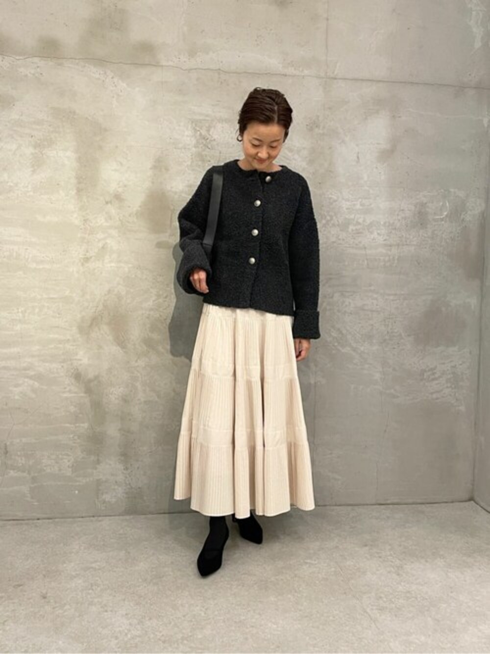 【ポコポコ前後ニット】 前後着られるボタンニット。 アンティークゴールドのボタンが派手すぎず、でも良いアクセントになってくれます。 お袖周りはゆったりなので、インナーにも困りません。 166cmで腰骨隠れる着丈で長すぎないので、スカートやワイドパンツとバランスがとりやすいです。 ボタンを前にして1番上を開けるとすっきり見えます。 手洗い可 【スカート】 細かいプリーツとティアードデザインで広がりにくいスカート。 裏地付きなのでアイボリーも透け感気になりません。 高身長サイズの2サイズは166cmでくるぶしほどの着丈です。