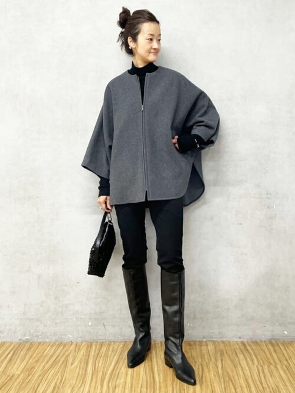 【コート】 昨年大人気だったウールポンチョコート。 今年は新色グレーとブラックで登場です。 中に着る服のデザインがドルマンスリーブでも地厚なニットでも上から羽織れます。 とても軽いですが、裏地付きで風も通しにくく時期長く使えます。 【ハイネック】 ウールですがチクチク感のないタートルで、ニットが苦手な方でも着やすいと思います。 ハイネックが高すぎなくて、首周りももたつきません。 手洗い可 【パギンス】 ストレッチ性抜群のコットンパギンス。 ブーツインもしやすいです。 【バッグ】 スパンコールが華やかなミニバッグ。 フォーマルシーンにも使えますし、普段デニムスタイルに持つのもアクセントになるのでおすすめです。