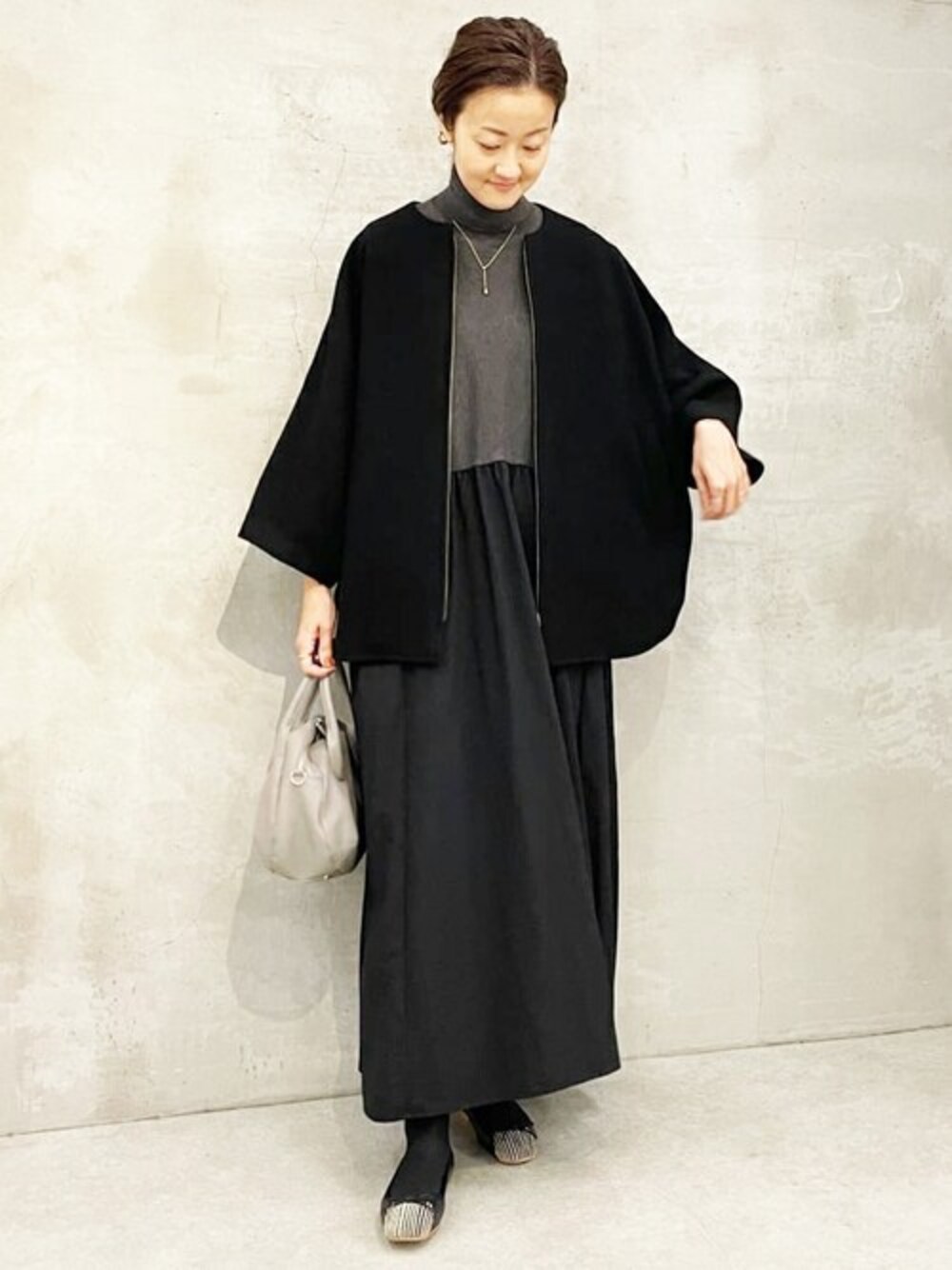 【コート】 こんなコートが欲しかったと人気のポンチョコートに色違いのブラックが登場。 ポンチョシルエットで中に着れないものはないデザイン。 裏地付きなので、ニットとの摩擦もなく着心地もストレスなしです。 【ワンピース】 切り替え上がニット、切り替え下がナイロンの布帛生地で1枚でおしゃれ見えするワンピース。 166cmでくるぶしほどの着丈で、高身長でもロング丈なのが嬉しい。 手洗い可 【パンプス】 8/25から予約スタートするデザインパンプス。 つま先がストライプのジャガード生地になっていてポイントになります。 レザーがとても柔らかく、ソールにもかなりクッション性があるので履き心地良いです。 普段のサイズを選んでいただければ良いかと思います。