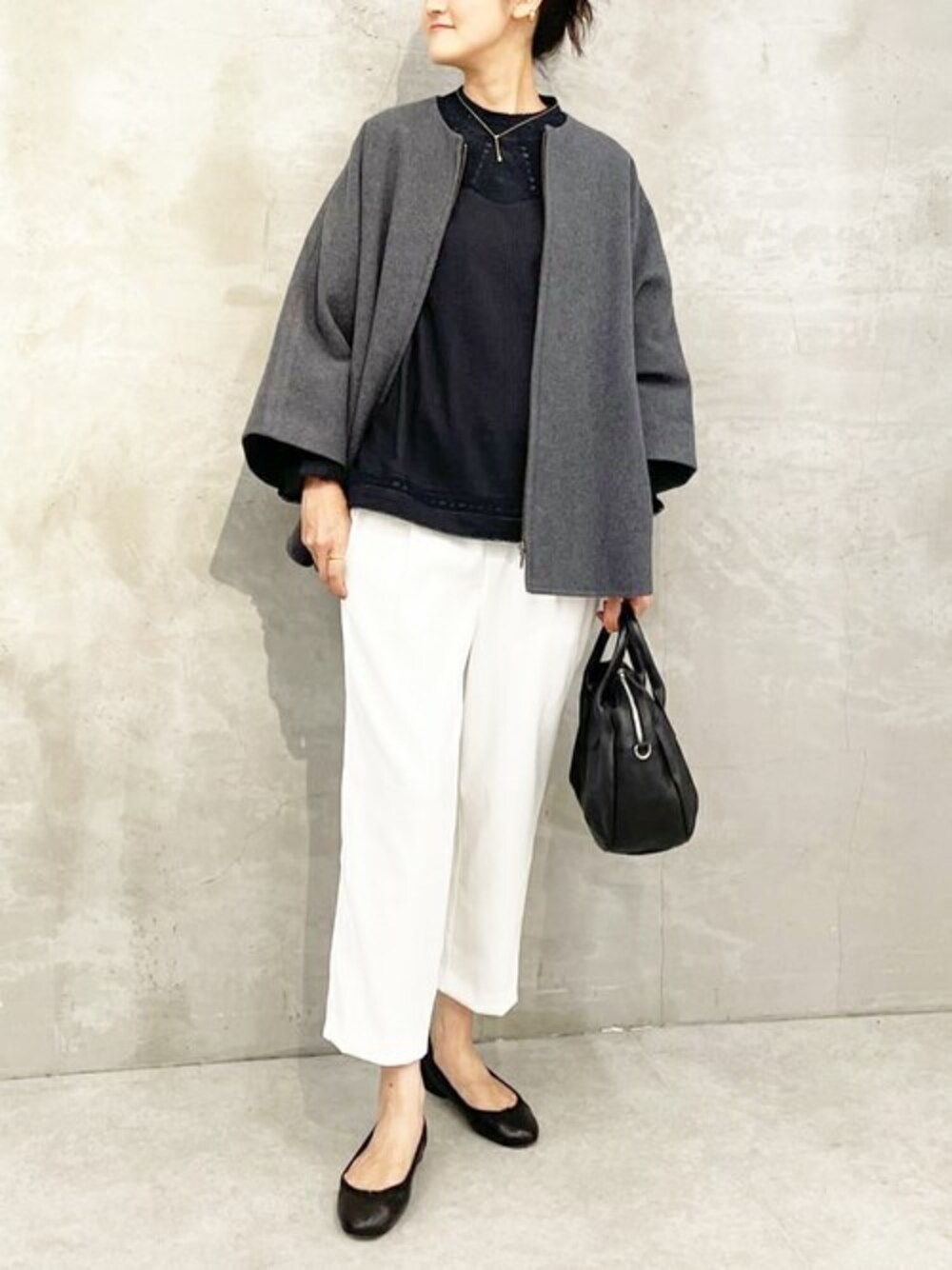 【ブラウス】 襟元や袖口、裾のリバーレースが上品なブラウス。 前後の身頃にあしらわれたピンタックや、肩のさりげないギャザーなど細かなデザインがビアズリーらしい素敵な1枚。 袖口はフリルデザインで、ゴムは入っていません。 スカート、パンツ問わず合わせられ、着る方の身長も関係なく着ていただけます。 手洗い可 【パンツ】 伸縮性抜群で履きやすいストレッチストレートパンツ。 比較的もも周りやふくらはぎ周りが余裕のあるシルエットで、着丈は166cmでくるぶし見える着丈です。 ウエストは後ろのみゴム。 手洗い可 【コート】 こんなコートが欲しかったと人気のポンチョコートに色違いのブラックが登場。 ポンチョシルエットで中に着れないものはないデザイン。 ON/OFF使える優秀デザイン。 お仕事や行事ごとにも頼りになります。
