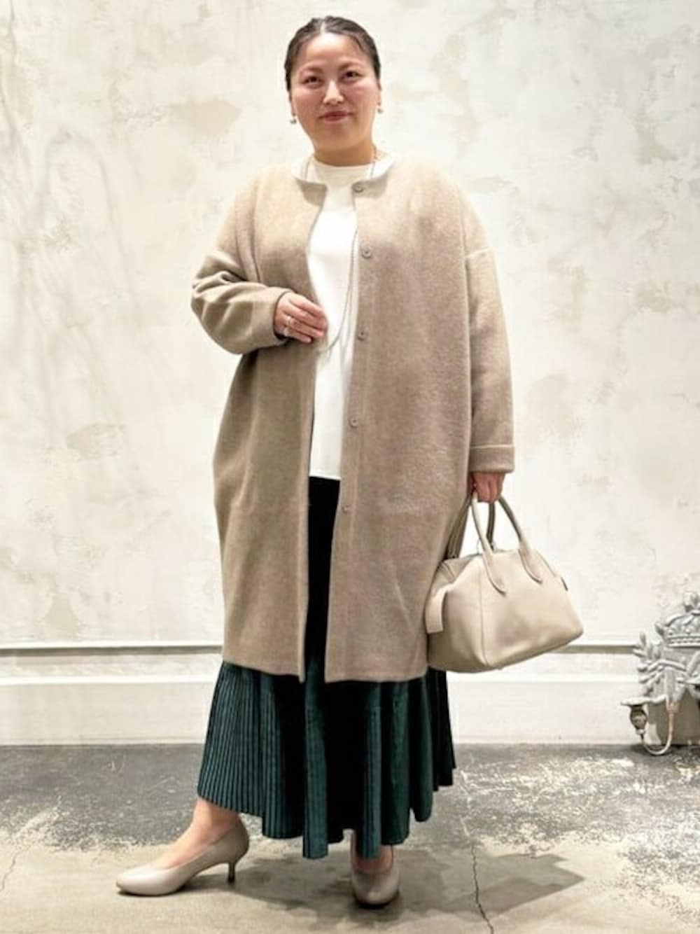 BEARDSLEY(BEARDSLEY)のノーカラーコート「ニットコートロング」を使ったコーディネート