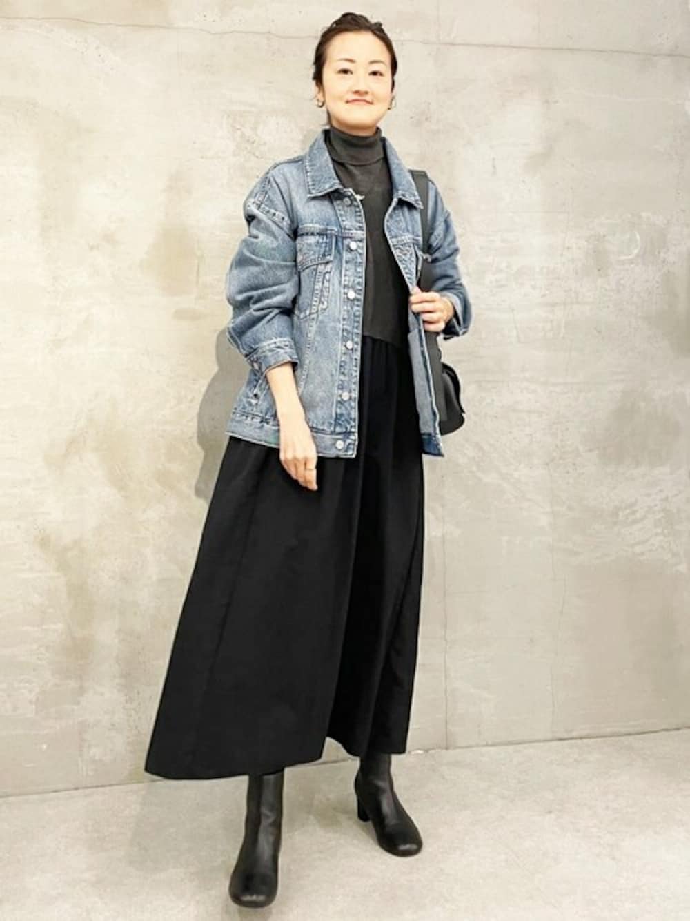 【Gジャン】 FRIPIERラインのデニムジャケット。 こちらはしっかりデニム生地で、デニム好きさんにおすすめ。 後ろ裾にタックが入り、立体感のあるフォルムになっています。 ゆったりシルエットで、袖口はボタンが2つついているので調節ができます。 【ワンピース】 切り替え上がニット、切り替え下がナイロンの布帛生地で1枚でおしゃれ見えするワンピース。 166cmでくるぶしほどの着丈で、高身長でもロング丈なのが嬉しい。 手洗い可