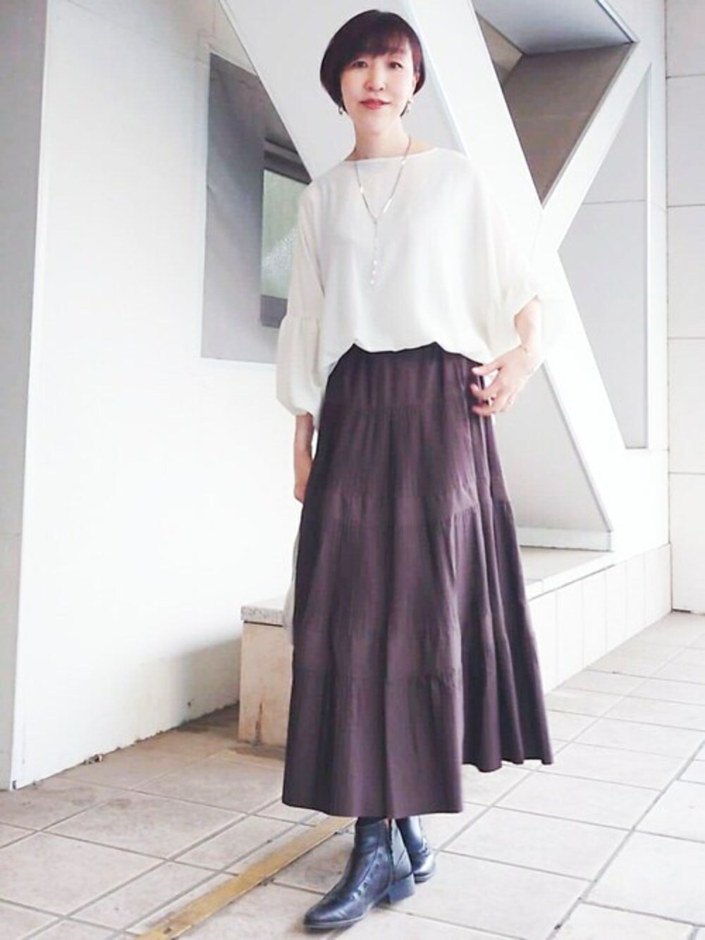 【blouse】 薄手ですがインナーにベージュ系のタンクトップを着て、そこまでインナーの透ける感じは気にならなかったです。 まだ暑い9,10月のお出かけにピッタリ。 顔映りの良いアイボリーはアラフィフ世代におすすめです。シワにもならなくて扱いやすいところも◎ 前だけ少しインしてスタイルアップさせても! インしなくてもそこまで長くないです。 【skirt】 しっとりしなやかなポリエステル生地を使用しており、また見た目も微光沢なので履くだけで上品な雰囲気になります! 広がりたくない部分はプリーツを入れていないので、広がって見えない嬉しいデザインです。 ウエストは総ゴムで楽ちんです! ※画像はウエスト一折してます 【bag】 小さすぎず、大きすぎず、必要最低限のものがしっかり入る見た目以上の容量の多さが人気の理由です! キズの目立たない質感のレザー、そしてどんな場面でも使えるシンプルなデザインなので、1つあれば大活躍すること間違いなしですよ。