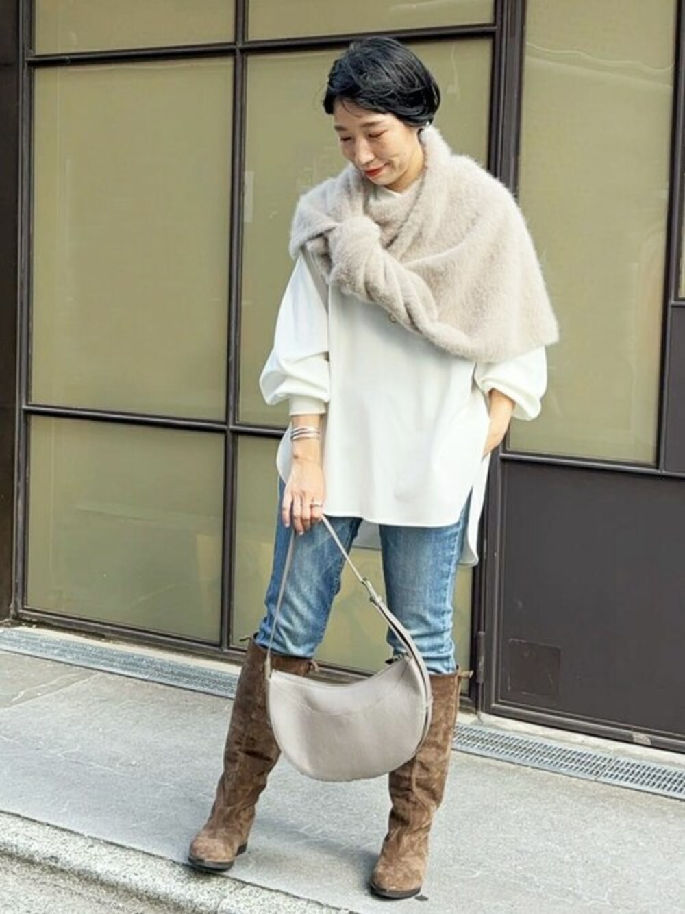秋を感じはじめたら、 小物で新鮮さをプラスするのがオススメ。 サラッとした着心地のTブラウスだと ファーニットポンチョの毛もつきにくいです。 大人カジュアルなデニムコーデも、 キレイ見えする小物をちょい足しするだけで、 一気に秋見えします♪ バッグも品のあるハーフムーンバッグをチョイス。 ポンチョのカラーと合わせてまとめました。 デニム×モカの組み合わせで、 カジュアルデニムもこなれ感ある大人コーデを 意識しました。