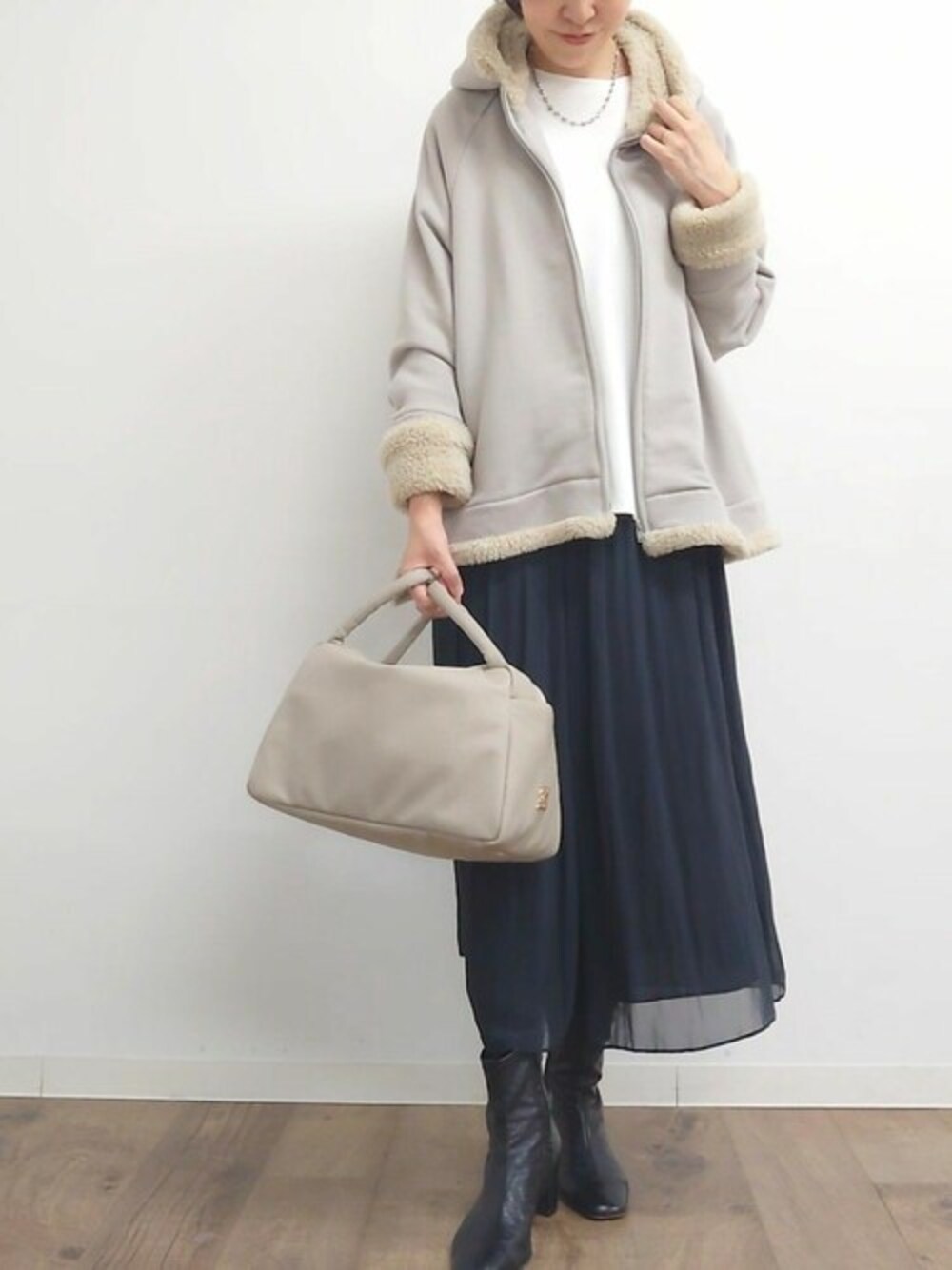 【パーカー】 パーカーって年齢重ねると、カジュアルすぎて難しいアイテムですがこれはボアをあしらったデザインなので、羽織るだけでおしゃれ見えします! フードの立ち上がる感じもリッチな雰囲気が出ますし、大人の方にぜひ取り入れてほしいアイテムです。