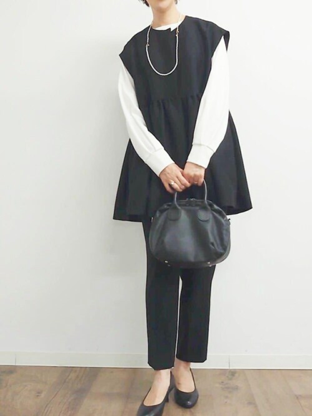 【ジレ】 微光沢で適度にハリ感ある生地なので、見た目から上質さが伝わります。 ギャザーが入り、腰周りにアクセントがつくことでスタイリングが華やかになります! セミフォーマルな場面にはもちろん、ちょっとしたお出かけにも役立つアイテムです。 【pants】 腰周りにタックが入っており、ヒップや太もものシルエットを拾わずに美脚に見えるデザインです。 サラサラとした生地感で全くシワにならないのも嬉しいポイント。 ウエストゴムで楽な履き心地ながらもきちんとした場面にも頼れるパンツです。 【bag】 小さすぎず、大きすぎず、必要最低限のものがしっかり入る見た目以上の容量の多さが人気の理由です! キズの目立たない質感のレザー、そしてどんな場面でも使えるシンプルなデザインなので、1つあれば大活躍すること間違いなしですよ。