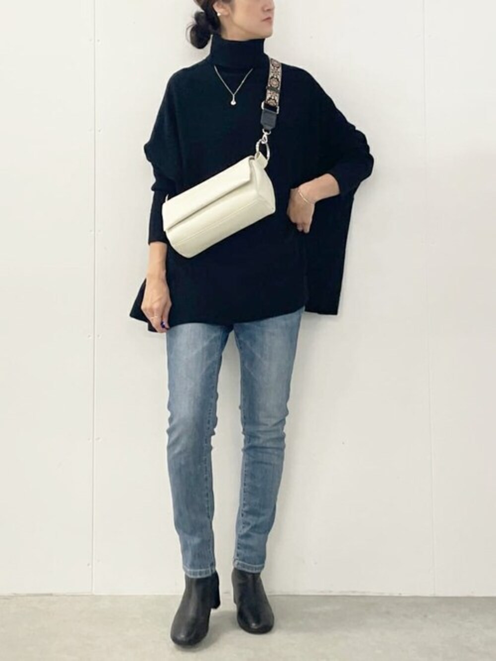 ディバッグのショルダーベルトでシンプルコーデのアクセントに。 ボディバッグはアイボリー ビッグニットタートルはブラック
