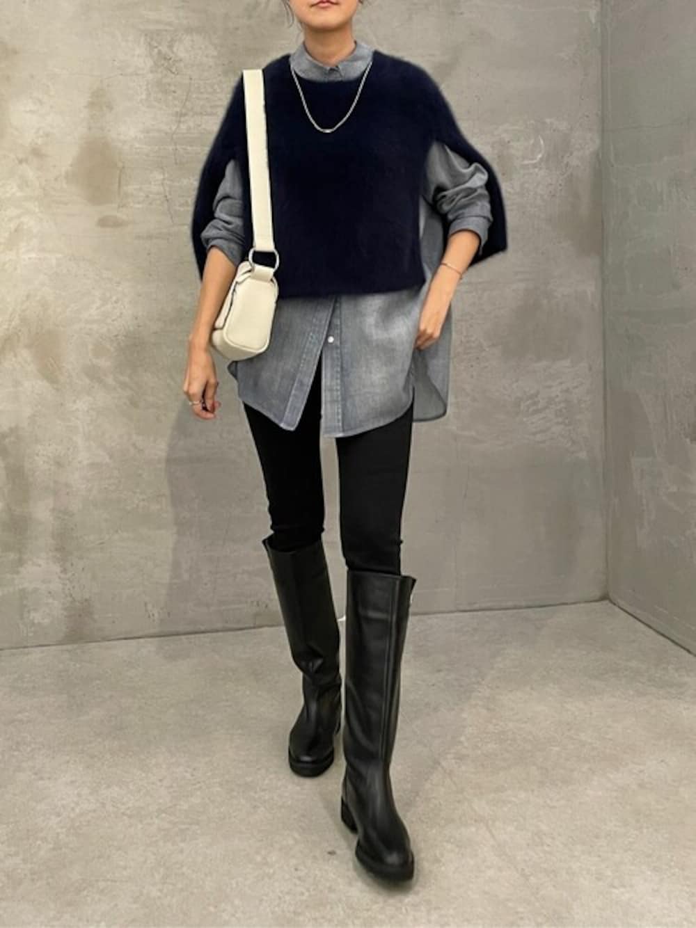 人気のシフォンデニムシャツ×ニットポンチョのコーディネート。 ポンチョはカーディガン代わりに持ち込んで、朝晩冷え込む時に調節するのに重宝しそう。 すっきり丈なので重心UP効果があるので身長選ばずに使えます。