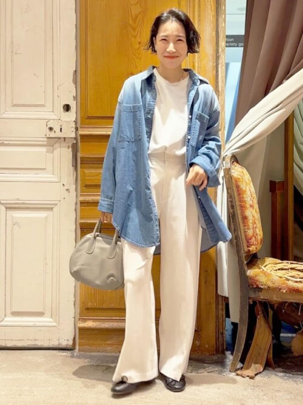 キレイなホワイトコーデも、 デニムシャツを羽織れば、 大人カジュアルに。