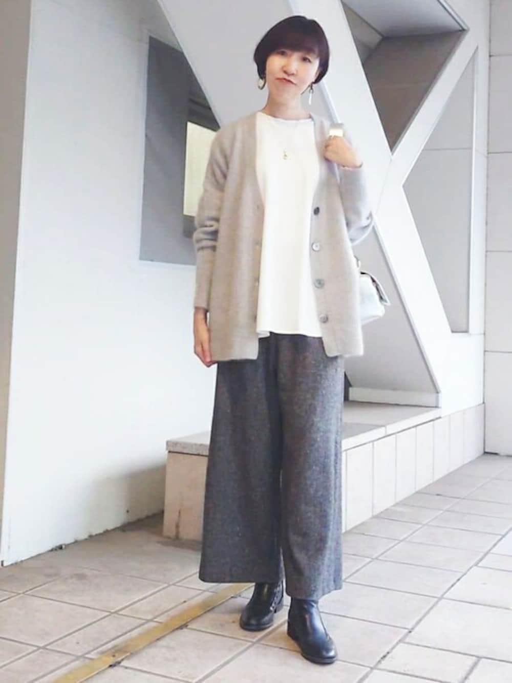 【knit】 ニュアンスカラーのグレージュは合わせやすく、アラフィフ世代の顔映りも明るく見せてくれます。 柔らかく軽い着心地です。 短すぎず長すぎずの着丈なので、合わせるアイテムも幅広く着回ししやすいデザイン。 【blouse】 その名の通り、Tシャツ感覚で着られるブラウスです。サラサラの生地に白も透け感のほぼない程よい肉厚感。 メインで着てもラフすぎず、インナーとしてレイヤードにしても使いやすいシンプルさが魅力。 前後差があるので、ヒップもしっかり隠れて安心感ありますよ。 【pants】 柔らかく滑らかなツイード生地を使用し、すっきり綺麗なシルエットです。 履くだけでスタイリングに温かみときちんと感が出て、秋冬にピッタリ! どのお色も使いやすいです。 裏地つきなので、タイツやレギンスを重ねて真冬も重宝すること間違いなしですよ。 【bag】 軽いレザーを使用していて、マチ広めのデザインなので容量もあり使いやすいです。 ポケット多めなところも嬉しいポイント。 ご旅行時などにも両手が空くので便利ですよ!