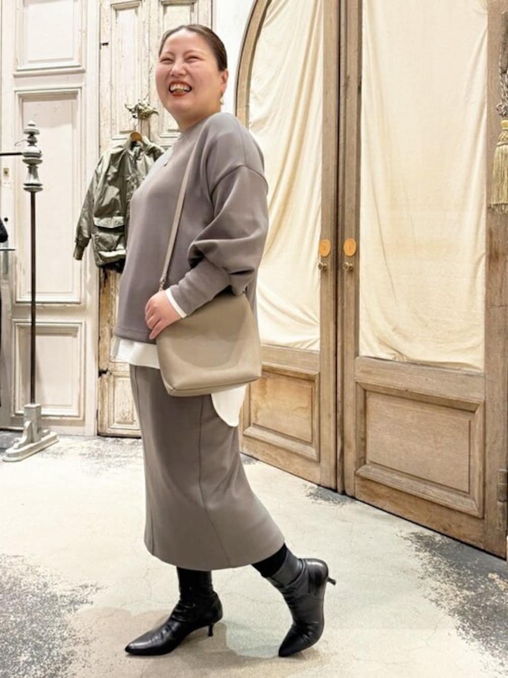 【トップス】ブラックをリアルバイしました。 もちもちしていて、ニットが苦手な方におすすめです! 気になる二の腕や腰まわり気にせず着れます。 シワになってもすぐ戻るので、旅行にも便利です。 寒い風を通しづらいので、1枚持っていると安心ですよ! 【インナー】フリーサイズ 0サイズ 着れない事はないのですが、、、 ⚫︎胸がつっぱる感じが気になります。 ⚫︎お袖は二の腕や袖丈は気にならなかったです。 ⚫︎着丈はちょうどいいですが、パンツスタイルの時はお尻出ます。 ⚫︎後ろは、お尻が大きくのでシワがドレープのようになります。私は気になってしまいます。 フリーサイズ ⚫︎安心感のあるサイズ感 ⚫︎胸のライン気にならないです。 ⚫︎お袖は少し私の腕だと長いので、手首を出して着るとちょうど良い。 ⚫︎後ろは、お尻気にせず着れます。 私の体型ですと、身体のラインをひろわないフリーサイズがすっきり着れるかな?と思います。 腰まわりやお尻が気になる方は、フリーサイズがおすすめです。 【スカート】2サイズ 私はウエストタイトでした! お尻とお腹ぽっこりしちゃうので、着丈長いトップスと合わせると綺麗に履けます。 ウエストより上にして履くと私は楽でした! トップスとお揃いでセットアップで着るのがおすすめですよ♩