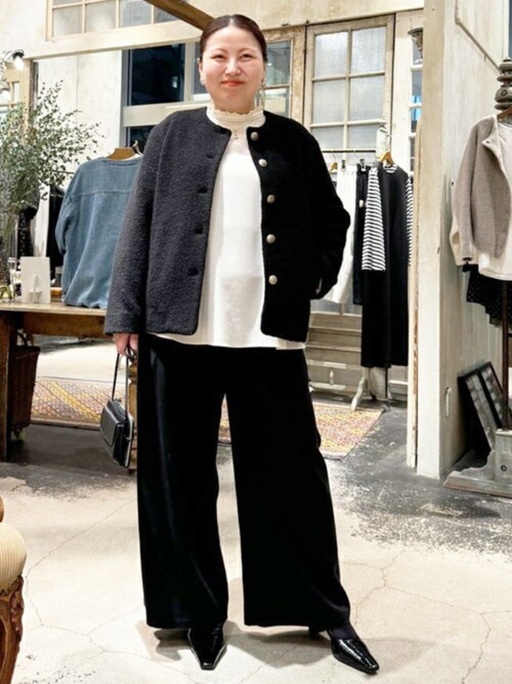 【ブルゾン】 もこもこしてますが、見た目よりもすっきり着れます。 ボタンも閉めれますよ! お袖は余裕あるので中にもう少し厚めのを着ても大丈夫です! きちんして見えるブルゾンあると便利です。 【ブラウス】 綺麗めに着たい時に1枚あると便利! 思ったより首まわりが苦しくなかったです。 お胸のつっぱりはありますが、キツくは無いです。 腰まわりがフレアでゆったり着れます。 二の腕が気にならないデザインです。 肩が小さく見えて嬉しい! 【パンツ】2サイズ着用 カジュアルにもキレイめにも着こなせる万能パンツです。 体型もカバーしてくれる優れもの!!! ウエストがリブとゴムなので楽ちん! 生地が柔らかく足のライン気にせず履けるのが好き。
