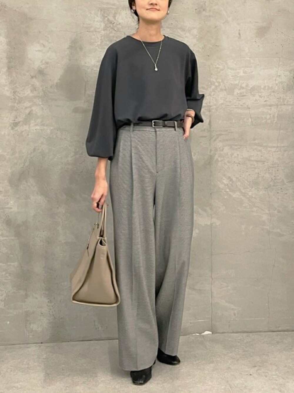 【Tブラウス】Fサイズ 大人気のTブラウス。 今回はグレーを合わせてみました。 透け感は全くなく、ボトムのカラーも白黒問わずに合わせられます。 裾がシャツカットになっているのでワイドパンツ合わせもバランスが取りやすいです。 手洗い可 【パンツ】2サイズ着用 リアルバイしたワイドパンツ。 両面起毛生地で柔らかく、これからの時期もあたたかく着れるタックバギーパンツ。 ウエストは後ろのみゴムでフロントジップなのでインスタイルも様になります。 センタープレス入り、細かいチェック柄なのでお仕事用にも使えます。 【バッグ】 持ち手の丸いデザインがポイントになるレザートートバッグ。 底や持ち手部分はフェイクレザー。 バックのみで自立するのでお仕事シーンで重宝しそう。 マチもかなり広いので書類はもちろん、お弁当箱なども入ります。